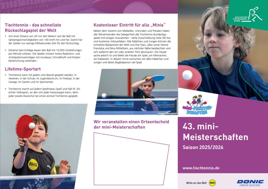 Am 07.02.2026 um 14:00 Uhr veranstaltet Lars Führmann eine Mini-Tischtennis-Meisterschaft in der MZH für Kids unter 13 Jahren – einzige Ausnahme: Es darf keine Spielberechtigung des DTTB vorliegen, beantragt oder besessen gewesen sein.